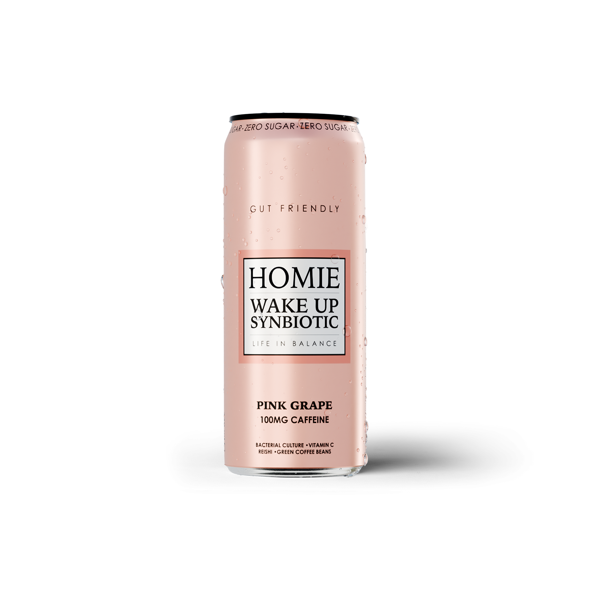 Wake Up Synbiotic från Homie är en kolsyrad dryck med koffein, levande bakteriekultur, reishi, cikoriarot samt utvalda vitaminer och mineraler.